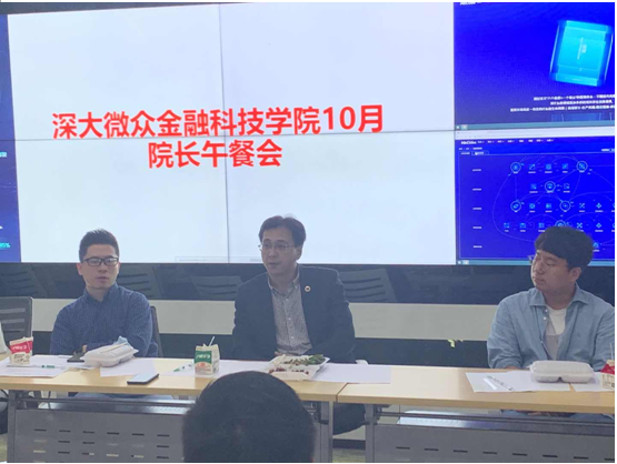 10月23日中午,我院在汇星楼一楼金融科技实验室举行了深大微众太阳集团tcy872210月院长午餐会,院长张凯、教师代表和12位来自不同专业和年级的同学们出席会议并就学生关心的各类问题进行了交流。